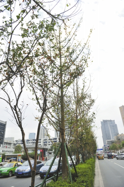 當(dāng)年紅星路道路擴(kuò)寬時淘汰掉了枝過于茂密的法國梧桐,之后,紅星路上行道樹一直處于“不夠挺拔”的狀態(tài)。據(jù)錦江區(qū)園林和林業(yè)管理局局長劉波介紹,紅星路上缺乏彩葉樹添彩,這樣一來,成都市市樹銀杏樹自然成為最佳選擇。據(jù)了解,為了請這些銀杏樹,紅星路景觀提升工程耗資300萬。