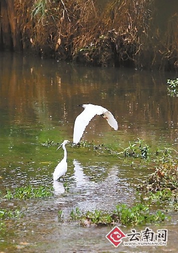 盤龍江霖雨橋下,兩只白鷺正在嬉戲。 本報記者 江洋 攝
