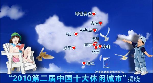 10月16日晚,在南京舉行的2010中國(國際)休閑發展論壇上,“第二屆中國十大休閑城市”評選揭曉,杭州、成都、南京、銀川、吉林、揚州、湛江、呼倫貝爾、秦皇島、舟山十城市榜上有名。