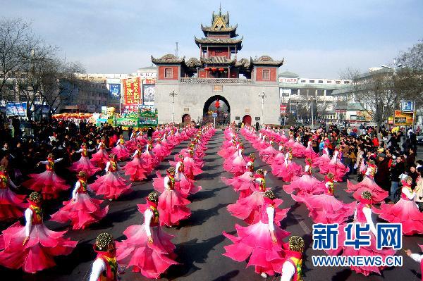 社火隊伍在銀川鼓樓前表演,歡天喜地鬧元宵(2002年2月12日攝)。 新華社發