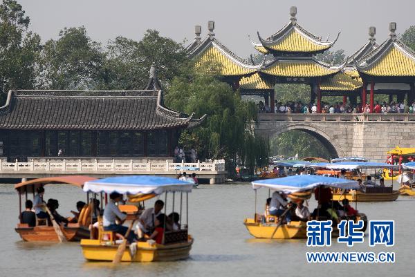 游客在揚州瘦西湖景區乘船游覽觀光(2007年10月4日攝)。新華社發