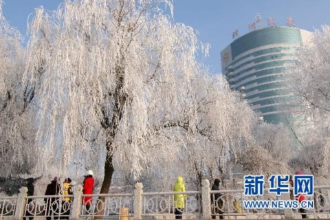 游客在吉林市花江畔觀賞霧凇美景(2008年12月28日攝)。新華社發