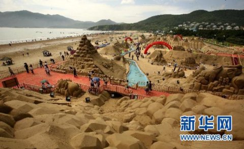 游客在舟山市南海海灘觀看沙雕作品(2010年10月2日攝)。 新華社發