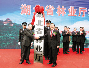 全國綠化委員會副主任、國家森林防火指揮部總指揮、國家林業局局長賈治邦,湖北省委書記、省人大常委會主任羅清泉,省委常委張昌爾,省委常委、省委秘書長李春明,省人大常委會副主任羅輝,副省長趙斌,省政協副主席鄭心穗出席揭牌儀式。李春明宣讀了省編委關于將湖北省林業局更名為湖北省林業廳并調整為省政府組成部門的通知,趙斌主持揭牌儀式。