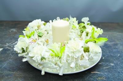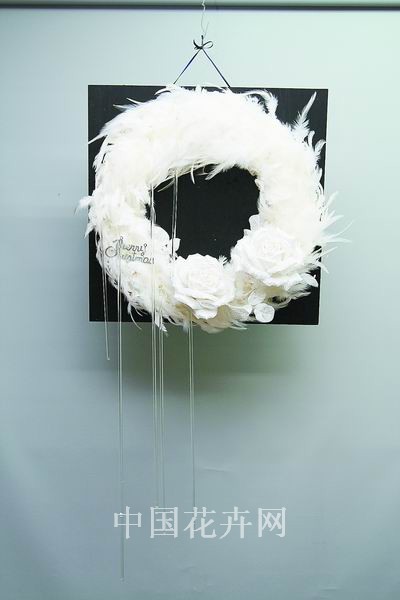 下圖:不同于一般圣誕花環(huán)使用白段裝飾,這個作品以白色的紙卷組合成圣誕圈兒,因為白色紙卷比白木更加潔白干凈和輕盈。其中的空隙加入許多的水晶飾品及白色羽毛,可讓這個圣誕環(huán)更閃亮。