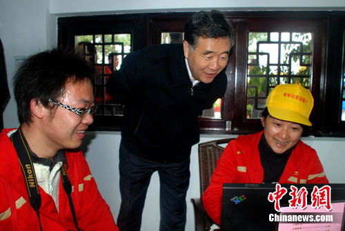 廣東省委書記汪洋(中)在廣州市海珠區小洲驛站內為青年記者們“審稿”。(吳敏平 攝 來源:中國新聞網)
