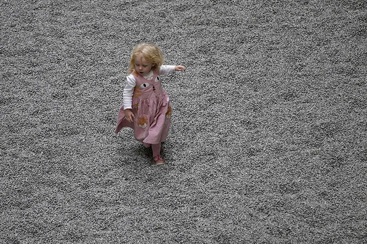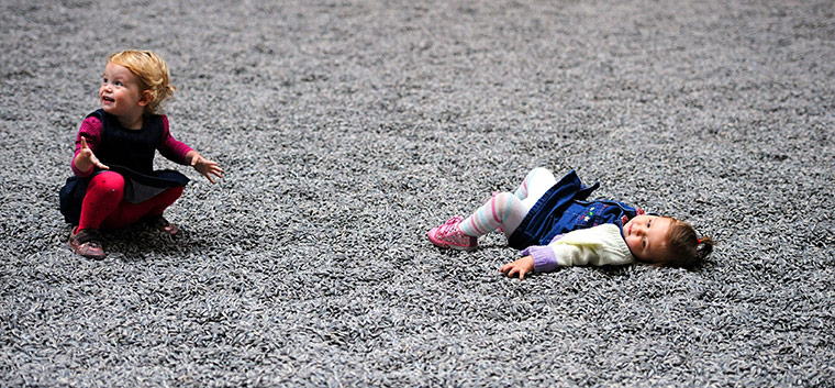 艾未未的設計最近揭曉了,他把1億顆“葵花籽”鋪在了輪機房大廳的地板上。“葵花籽”并非真正的葵花籽,而是景德鎮的瓷制品,每顆手工繪制,所以1億顆葵花籽每顆都不同。1億顆瓷制的葵花籽鋪在地上,就像踩在粗石沙灘上一般。《衛報》網站上有一組這個展覽的照片。
