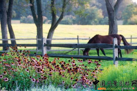 馬兒休閑地在圍欄外吃果菊正在盛開,細(xì)碎如羽毛般的阿肯色藍(lán)星花在一旁輕盈搖曳,一派田園自然景象。