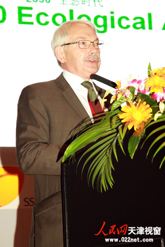英國奧雅納(ARUP)全球公司主席Peter Head在首屆中國國際生態城市論壇上做主題演講分論壇“夢想與挑戰 生態城市建設的技術集成”上做主題演講。(攝影:楊秋煜)