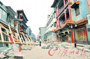 7月底,記者來到前門大街大柵欄改造現(xiàn)場。昔日熙熙攘攘的商業(yè)街上如今是一派繁忙景象:修整路面、清理垃圾、煙塵漫天……石師傅正埋頭工作。他告訴記者,整個大柵欄的改造將在月底前完工。