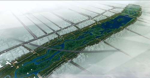灞橋濱河生態公園景觀規劃設計鳥瞰 11月8日上午,灞橋濱河生態公園景觀規劃設計方案最終確定,北京土人景觀設計研究院提供的方案獲得評標會專家及政府官員一致首肯。灞橋區區長聶仲秋稱,依照該方案實施建設的灞橋濱河公園預計將于后年“五一”開園迎客。 據介紹,灞橋濱河生態公園位于西安古城東北約6000米處、灞橋東北部,南起西康鐵路橋,北至隴海鐵路橋,總長為4.5千米,總規劃面積約為2.85平方千米,沿河兩岸約50米范圍內為濱河公園。 本次規劃設計包含濱河公園、堤岸及親水碼頭等。公園東北側緊鄰隴海鐵路、西潼公路、西臨高速,西南側有西安繞城高速、西藍公路,濱河路貫穿公園首尾,折柳送別的古隋唐灞橋遺址及古長安八景之一“灞柳風雪”均位于公園內,多處自然濕地、多種水禽棲息,是該園得天獨厚的生態條件。灞橋濱河公園建成后,將是西安第一家開放式濱河生態公園。 灞橋濱河新景不僅將重現隋唐盛景,充分展示灞橋歷史文化和自然美景,更將結合周邊已有規劃,成為能夠滿足休閑、商貿功能要求的城市綜合性公園。同時,新景設計也合理組織了車行及人行交通系統,并且具備蓄水防洪、抗震防災功能。