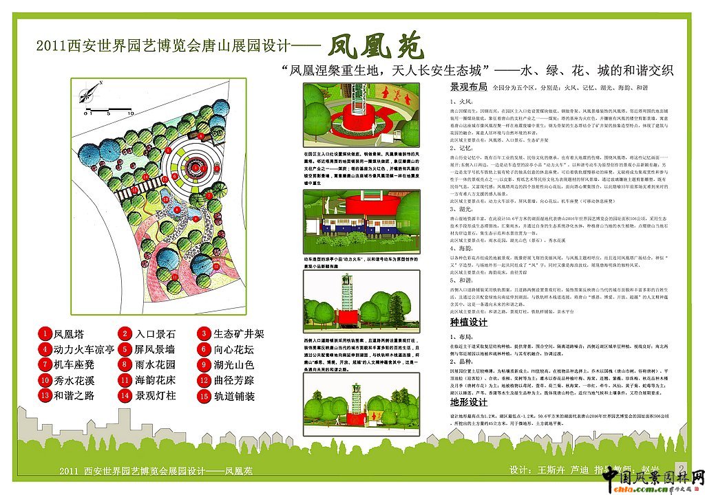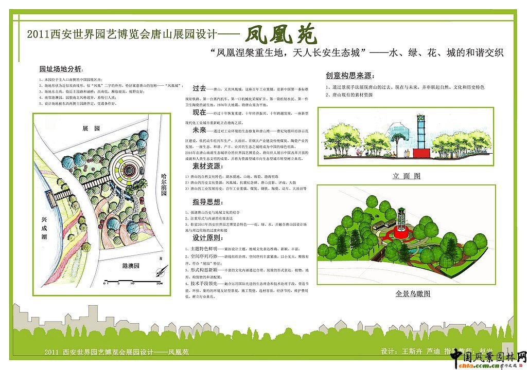 中國風景園林網訊 為配合2011西安世界園藝博覽會唐山展園的設計,提高南京林業大學風景園林專業大學生的規劃設計水平,鼓勵和激發大學生的創造性思維,引導大學生對風景園林學科和行業發展前沿性問題的思考,南京林業大學風景園林學院聯合河北省唐山園林局舉辦"2011西安世界園藝博覽會唐山園設計競賽"。以下為第五名作品。 2011西安世界園藝博覽會唐山展園設計--鳳凰苑 園址場地分析: 1.本園位于主入口南側的中國園展區內; 2.場地形狀為近似雙曲線形,似“鳳凰”二字的外形,恰好寓意唐山的別稱--“鳳凰城”; 3.場地東北高,臨近主園路和涵橋;西南低,瀕臨湖面,視野良好; 4.南鄰港澳園,園貌南北風格迥異,易吸引人流; 5.設計場地被東西兩側主園路界定,交通條件好。 創意構思來源: 1.通過景觀手法展現唐山的過去、現在與未來,并串聯起自然、文化和歷史特色 2.唐山現有的素材資源 ![]() ![]() 西安世園會唐山園設計一等獎作品 西安世園會唐山園設計二等獎作品 西安世園會唐山園設計三等獎作品