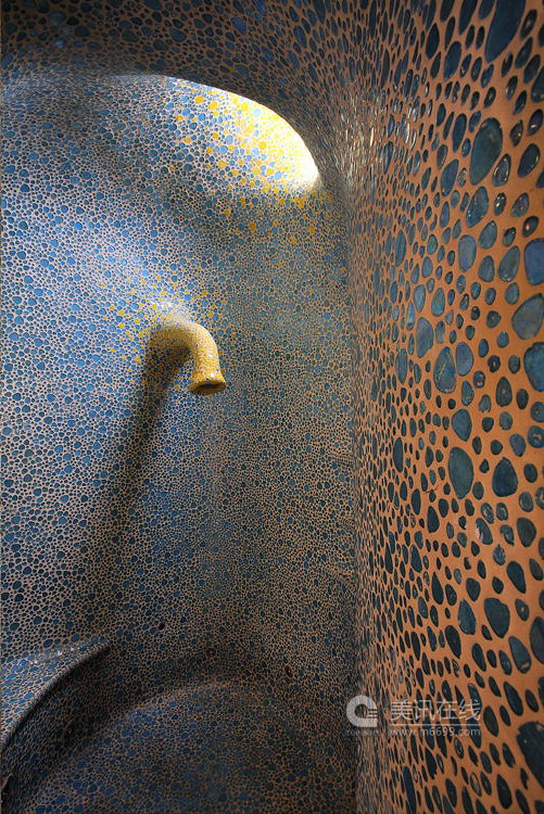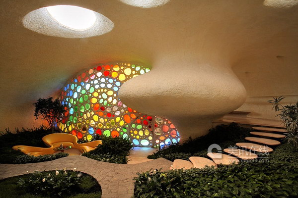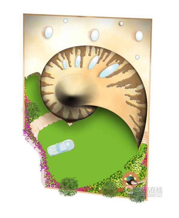 經過無數次修改后,形成了一個鸚鵡螺式的結構。居住在其中似乎像蝸牛一樣,從一個房間緩慢移動到另一個房間,頗似共生的化石住所。住宅中沒有任何劃分,在三維的和諧空間中你會發現第四維的動感,從樓梯盤旋而下的時候感覺就像軟體動物趴在植被上。