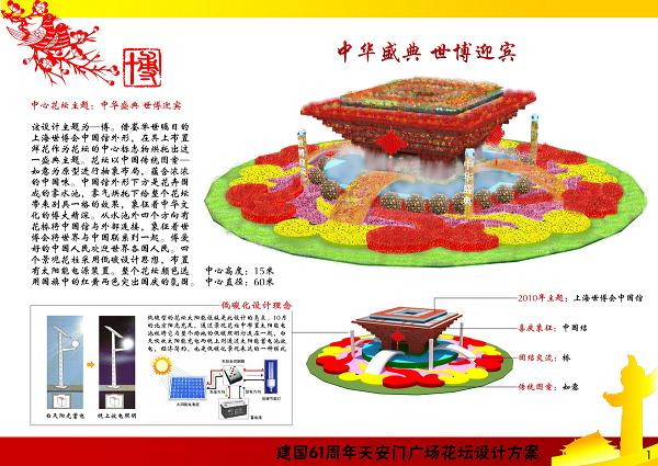 日前,一年一度的2010年天安門廣場花壇創(chuàng)意設計競賽作品征集結束,北京林業(yè)大學園林學院共有11支學生團隊推出12個創(chuàng)意設計方案。 本次天安門廣場花壇創(chuàng)意設計競賽以天安門廣場中心花壇(直徑60米)及兩側畫卷花壇(各寬30米、長160米)為設計場地,設計要素包括(一)2010年——2011年國家熱點大事:如今年兩會的重要精神、低碳經(jīng)濟、2010上海世博會、2011年西安的世園會等;(二)新中國成立61周年以來偉大祖國各行各業(yè)所取得的輝煌成就;(三)中華民族五千年文明的神州大地的名山大川或經(jīng)典景點;(四)國家繁榮昌盛、民族大團結、人民安居樂業(yè),和諧社會的大好局面面;(五)大國首都謀劃未來,建設世界城市等五個方面。