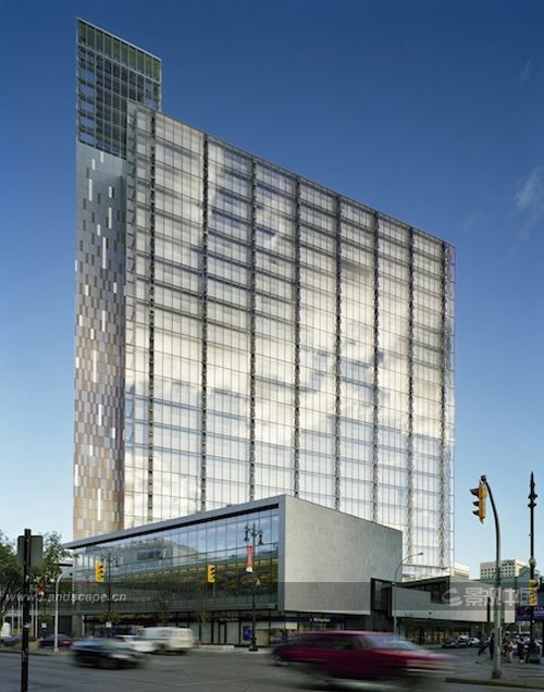 Kuwabara Payne McKenna Blumberg Architects設(shè)計的馬尼托巴水電廣場 這個22層的辦公樓里駐扎著馬尼托巴最主要的能源公司。 能源需求由控制曝光量的計算機管理,以及很多的被動加熱和降溫機制。