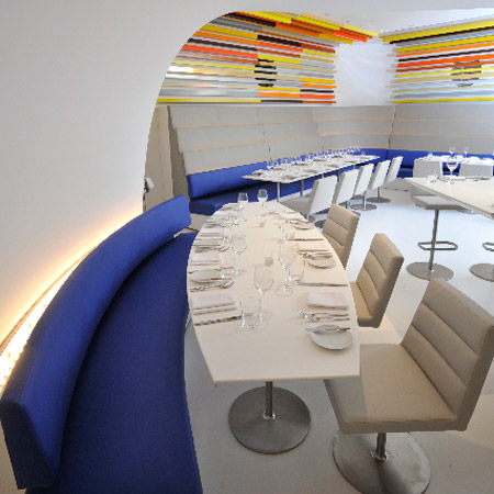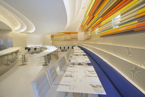 安德烈-基科斯基為這個博物館設計的餐館,以他將賴特的設計語言轉換進一個小的空間的能力受到贊揚,并且以藝術家廉姆-吉列克(Liam Gillick)設計的輝煌的彩色鋁墻雕塑增強了效果。安德烈-基科斯基對記者說:“我們的色彩的運用是溫和與克制的——盡管它是鮮明和大膽的。我們都致力于一種思想,餐館必須有博物館的氛圍,藝術和建筑要完美地結合在一起。” 安德烈-基科斯基說:“由于我們尋求打造一種創新的和有藝術靈感的建筑,我們很高興從‘詹姆士-比爾德基金會’獲得了這個榮譽。” 盡管經濟衰退對餐館業有消極的影響,安德烈-基科斯基在這個設計種類遇到了激烈的競爭。安德烈-基科斯基以他在現有建筑物內和在變化的街區內的設計技能倍受尊敬。他大膽在承擔了在古根海姆博物館內的特殊的設計工作。在對這個博物館的文件進行幾周的研究之后,安德烈-基科斯基和他的團隊終于勇敢地圖紙上落筆。