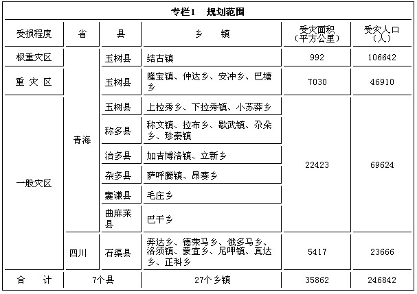 前 言 2010年4月14日7時(shí)49分,青海省玉樹地區(qū)發(fā)生7.1級強(qiáng)烈地震,人民群眾生命財(cái)產(chǎn)遭受嚴(yán)重?fù)p失。在黨中央、國務(wù)院和中央軍委的堅(jiān)強(qiáng)領(lǐng)導(dǎo)下,災(zāi)區(qū)廣大干部群眾奮起自救,社會(huì)各界積極支援,全力搶救生命,及時(shí)救治傷員,妥善安置群眾,恢復(fù)正常秩序,取得了抗震救災(zāi)重大階段性勝利。 玉樹地震災(zāi)后恢復(fù)重建意義重大,建設(shè)新家園、新校園、新玉樹,是災(zāi)區(qū)群眾的熱切期盼,是全國各族人民的共同心愿。災(zāi)后恢復(fù)重建工作要以科學(xué)發(fā)展觀為指導(dǎo),堅(jiān)持以人為本,尊重自然,統(tǒng)籌規(guī)劃,合力推進(jìn),從玉樹經(jīng)濟(jì)社會(huì)、自然地理、生態(tài)環(huán)境、民族宗教文化等實(shí)際情況出發(fā),借鑒汶川地震災(zāi)后恢復(fù)重建的成功經(jīng)驗(yàn),切實(shí)把災(zāi)后恢復(fù)重建與加強(qiáng)三江源保護(hù)相結(jié)合、與促進(jìn)民族地區(qū)經(jīng)濟(jì)社會(huì)發(fā)展相結(jié)合、與扶貧開發(fā)和改善群眾生產(chǎn)生活條件相結(jié)合、與保持民族特色和地域風(fēng)貌相結(jié)合,建設(shè)生態(tài)美好、特色鮮明、經(jīng)濟(jì)發(fā)展、安全和諧的社會(huì)主義新玉樹。 為科學(xué)、依法、統(tǒng)籌,有力、有序、有效地推進(jìn)災(zāi)后恢復(fù)重建工作,依據(jù)《中華人民共和國防震減災(zāi)法》、《國務(wù)院關(guān)于做好玉樹地震災(zāi)后恢復(fù)重建工作的指導(dǎo)意見》(國發(fā)〔2010〕14號)、《國務(wù)院關(guān)于支持玉樹地震災(zāi)后恢復(fù)重建政策措施的意見》(國發(fā)〔2010〕16號),在災(zāi)害評估、資源環(huán)境承載能力綜合評價(jià)和房屋及建筑物受損程度鑒定的基礎(chǔ)上,經(jīng)過科學(xué)評估、專家論證,制訂本規(guī)劃。 第一章 災(zāi)區(qū)概況和重建基礎(chǔ) 第一節(jié) 災(zāi)區(qū)概況 玉樹地震給災(zāi)區(qū)人民生命財(cái)產(chǎn)造成重大損失。截至2010年5月30日18時(shí),遇難2698人,失蹤270人。居民住房大量倒塌,學(xué)校、醫(yī)院等公共服務(wù)設(shè)施嚴(yán)重?fù)p毀,部分公路沉陷、橋涵坍塌,供電、供水、通信設(shè)施遭受破壞。農(nóng)牧業(yè)生產(chǎn)設(shè)施受損,牲畜大量死亡,商貿(mào)、旅游、金融、加工企業(yè)損失嚴(yán)重。山體滑坡崩塌,生態(tài)環(huán)境受到嚴(yán)重威脅。 根據(jù)青海玉樹地震災(zāi)害評估報(bào)告,玉樹地震波及范圍劃分為極重災(zāi)區(qū)、重災(zāi)區(qū)、一般災(zāi)區(qū)和災(zāi)害影響區(qū)。本規(guī)劃范圍包括極重災(zāi)區(qū)、重災(zāi)區(qū)的各項(xiàng)恢復(fù)重建內(nèi)容,以及一般災(zāi)區(qū)中受損居民住房和學(xué)校、醫(yī)院等公用設(shè)施,涉及青海省玉樹藏族自治州玉樹、稱多、治多、雜多、囊謙、曲麻萊縣和四川省甘孜藏族自治州石渠縣等7個(gè)縣的27個(gè)鄉(xiāng)鎮(zhèn),受災(zāi)面積35862平方公里,受災(zāi)人口246842人。