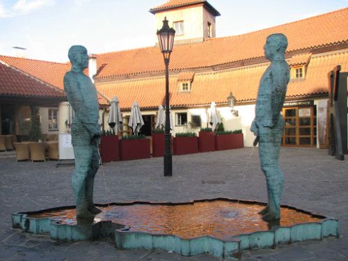 這兩個(gè)撒尿男子的噴泉放置于捷克首都布拉格的伏爾塔瓦河附近的卡夫卡博物館門口,讓人無法接受的是這兩個(gè)電動(dòng)小人在撒尿的時(shí)候居然完全模仿人在撒尿時(shí)的各種動(dòng)作,看起來不僅沒有歐洲大多數(shù)噴泉給人的美感,客觀地講甚至還有一種低級(jí)下流的感覺,這樣的噴泉對(duì)于童話般的城市布拉格來說實(shí)在有點(diǎn)小煞風(fēng)景.