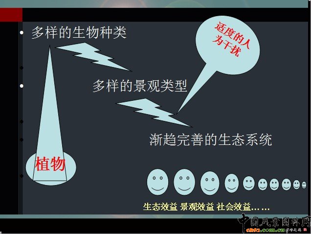 董 麗 北京林業大學園林學院 感謝項目組其他參與人員: 李湛東教授 北京林業大學園林學院 李春嬌 北京林業大學 園林學院 ![]() 正確處理下述關系: 植物和人之間 研究背景 ◆ “通向自然的軸線”北京奧林匹克森林公園 ◆ 植物景觀生態規劃設計? 概念的引入 ◆ 近自然園林-在自然地形和氣候條件基礎上和生態學原理的指導下,以協調人地關系為核心,以植物群落為主體的具有多功能效益的進展演替的生態經濟園林系統。 ◆ 近自然園林植物景觀-盡可能地保留原生狀態的自然植物群落;在充分掌握當地自然群落構成和演替規律和植被景觀特征的基礎上“模擬”自然植物群落和地域植被景觀的特征。 ◆ 自然度(naturalness) 自然度又稱自然性、天然性程度,是指自然的保存程度。一般認為它是自然生態系統遭到人類破壞程度的度量指標。 自然度的劃分--采用等級分化方法。目前 Machado Blangy and Mota(1994)自然系統的0-10級分級方法是最為完善的一種方法。 ![]()