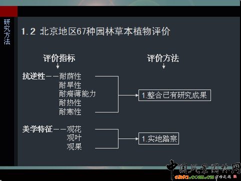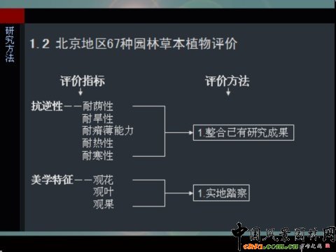 ![]() 如何構建近自然園林植物景觀……? 技術路線 ![]() 第一部分 北京常見園林植物評價 研究內容 ◆ 北京地區常見140種園林木本植物打分、排序; ◆ 北京地區67種園林草本地被植物定性評價。 研究方法 ![]() ![]() ![]()