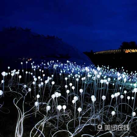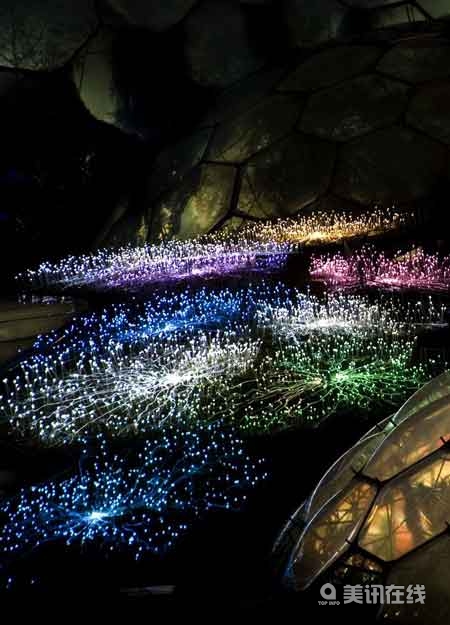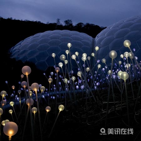 燈光設(shè)計(jì)師Bruce Munro在英格蘭康沃爾的伊甸園項(xiàng)目中完成了他的燈光原野裝置,這是他和5名助手花了三天時(shí)間安裝完成的。該裝置被安放在中心屋頂?shù)?a href="http://plant.www.81fl.com" target="_blank" title="植物">草皮上面,共有11個(gè)外置投影儀,整個(gè)裝置大小為60 X 20米,根本不需要用電就能發(fā)光。其由6,000個(gè)丙烯酸管子上覆蓋玻璃球體構(gòu)成,共使用看24,000米長(zhǎng)的光導(dǎo)纖維。每一個(gè)里面都有光導(dǎo)纖維,這組璀璨的設(shè)計(jì)將展示到2009年的春天,在夜晚,越發(fā)顯得璀璨。