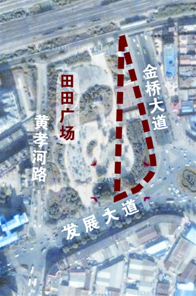 根據(jù)建設(shè)規(guī)劃,田田廣場東南側(cè)上方將建設(shè)竹葉山立交匝道,施工結(jié)束后再重新綠化。遷移范圍從北側(cè)鐵路開始,沿弧線走向發(fā)展大道,遷移面積約2000平米。遷移后,田田廣場將從目前的不規(guī)則四邊形變成一把“菜刀”(如圖)。施工方介紹,除綠化外,廣場內(nèi)東南角的部分休閑場地也將被“切”掉,但面積僅數(shù)十平米。