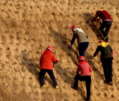 2010年元月4日以后陜西寶雞遭受寒流襲擊。寶漢高速公路工地也在刺骨寒風中哆嗦,但在BP14標管區挖方邊坡上,綠化施工人員頭戴紅色安全帽仍在邊坡上你追我趕忙著施工。