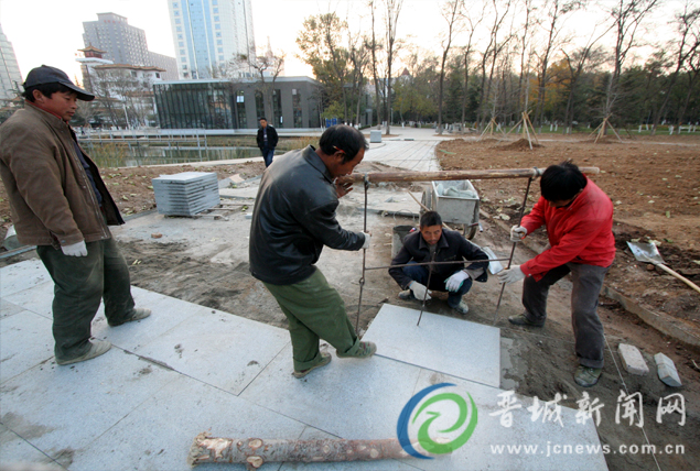 昨日,在兒童公園二期擴建工程施工現場,幾名工人正在鋪裝石板路。