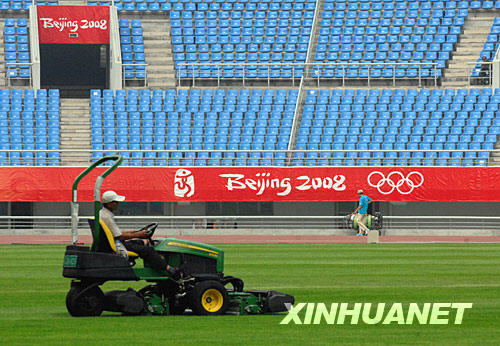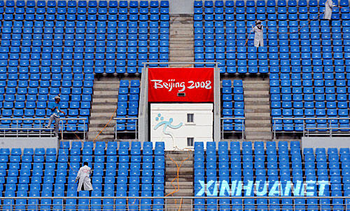 圖為工作人員在沈陽奧體中心五里河體育場內檢查觀眾席的座位(攝于7月22日)。 新華社記者謝環馳攝