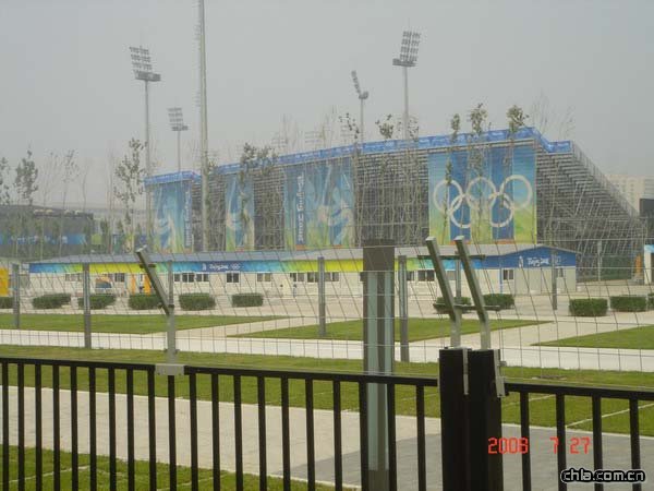 五棵松棒球場由三塊場地組成,“好運北京”國際棒球邀請賽的大部分賽事將被安排在2號比賽場進行。2號比賽場的北側(cè)是本次邀請賽駐場館團隊的辦公樓。說是辦公樓,實為簡易的兩層活動房屋,這節(jié)約了成本,體現(xiàn)了“節(jié)儉辦奧運”的觀念。
