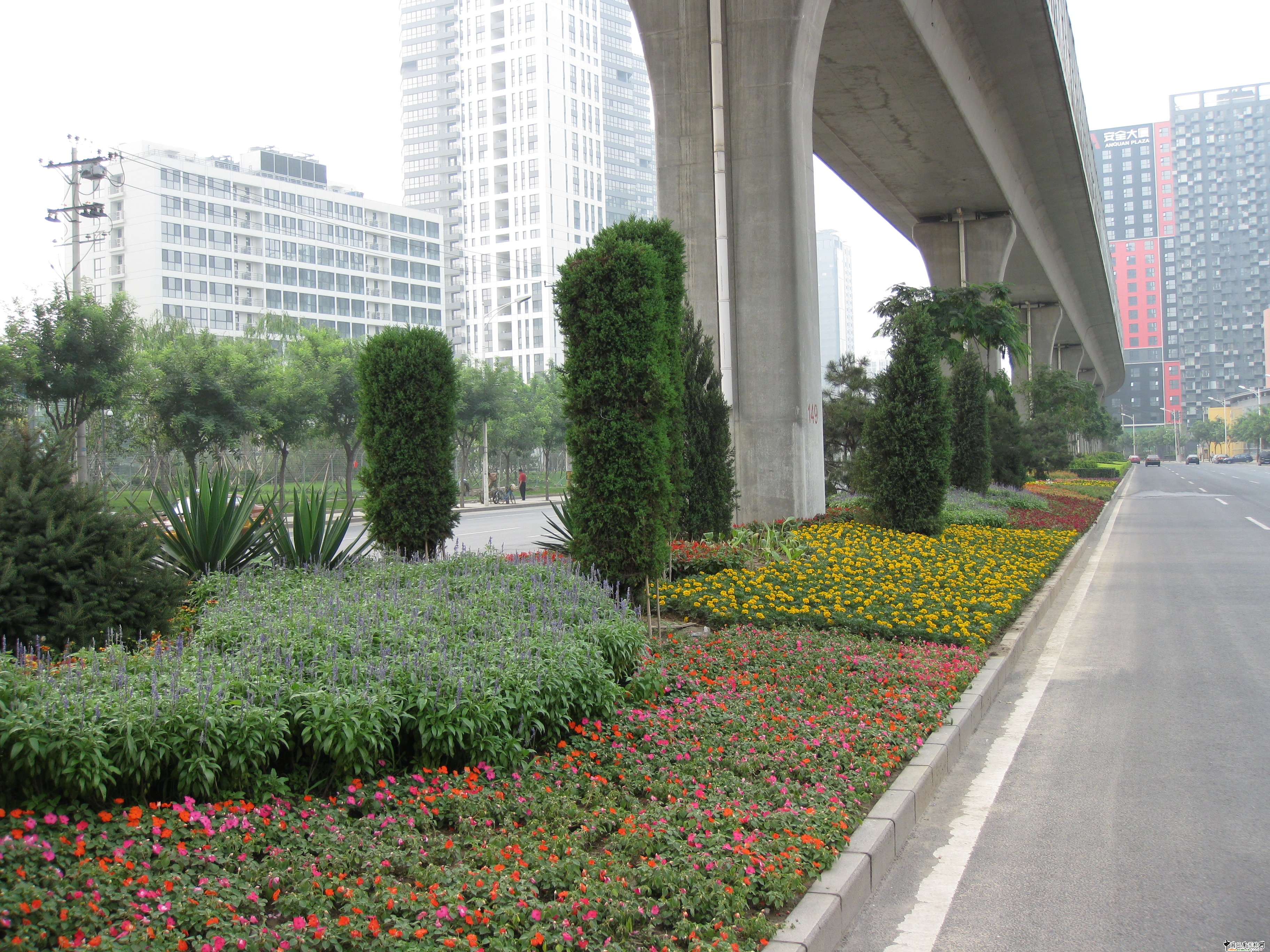中國風景園林網 北苑路高架橋道路工程南起現況北苑路、向北經規劃環科院北路、規劃立水橋東路等地,至立湯路,道路全長約為5400米。北京朝園弘園林綠化有限責任公司施工范圍南起北四環,北至立水橋外朝陽區區界,實際綠化面積46245平米。