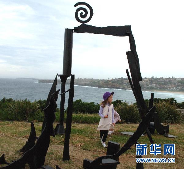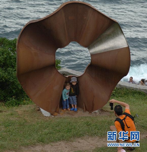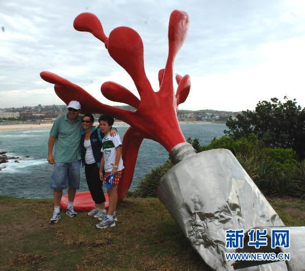 10月31日,在澳大利亞悉尼的邦迪海灘,游客在大型鐵皮雕塑旁合影留念。一年一度的邦迪海濱雕塑展10月28日至11月14日在澳大利亞悉尼的邦迪海灘舉行。在長約兩公里的海灘上,澳大利亞和世界各地的藝術家們展示了他們創作的100多件雕塑作品,游客在海邊散步時就可欣賞。與往年一樣,今年的作品形態各異,包括人物、動物等各類藝術造型。雕塑展預計將吸引近50萬游客前來參觀。首屆邦迪海濱雕塑展于1997年舉辦,今年是第14屆。