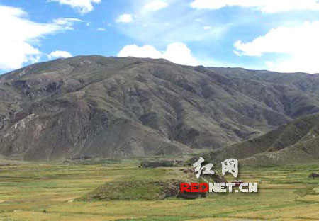 沿著瓊結縣城往西南方向繼續前行,遠遠望去,只見白云藍天下,河谷平原上排列著10來座形如土丘樣的山包,與周圍的山丘地形渾然一體,顯得分外壯觀,司機告訴我,那便是赫赫有名的古藏王墓群。這里風光秀麗,南北兩面山脈連綿,中部一塊狹長平地,河流從中穿流而過。田原、山峰、河流、藏胞的房屋和藍天白云構成一幅天然的山水畫,顯然是一處風景絕好的風水寶地。
