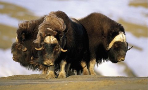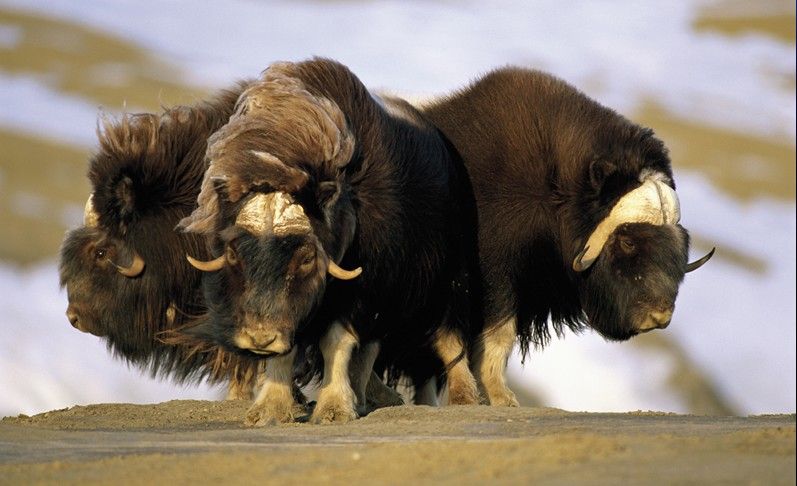 格陵蘭島,薩肯博格。麝牛以一種稀少的植物為食,這種植物只有在當(dāng)?shù)叵募具_(dá)到華氏50度的時(shí)候才開(kāi)始生長(zhǎng)。冬季的時(shí)候,當(dāng)?shù)氐臍鉁伢E降至華氏31度,麝牛靠自己堅(jiān)硬的蹄子刨開(kāi)凍土層獲取食物。日益增多的沉淀物和多變的溫度會(huì)嚴(yán)重破壞麝牛的食物,這也許會(huì)成為消滅麝牛種群的潛在殺手。