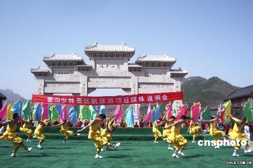 資料圖為:2007年3月25日,河南登封市少林景區管理局舉辦特色旅游項目發布會,宣布登封少林景區將從四月份啟動預算總投資六千多萬元人民幣的“少溪河景觀整治工程”,計劃恢復水系,形成水庫、湖泊、溪流、山澗、瀑布等水體形態,整治后的少溪河將重現“碧溪鎖少林”的優美意境。圖為發布會現場的少林武術表演。